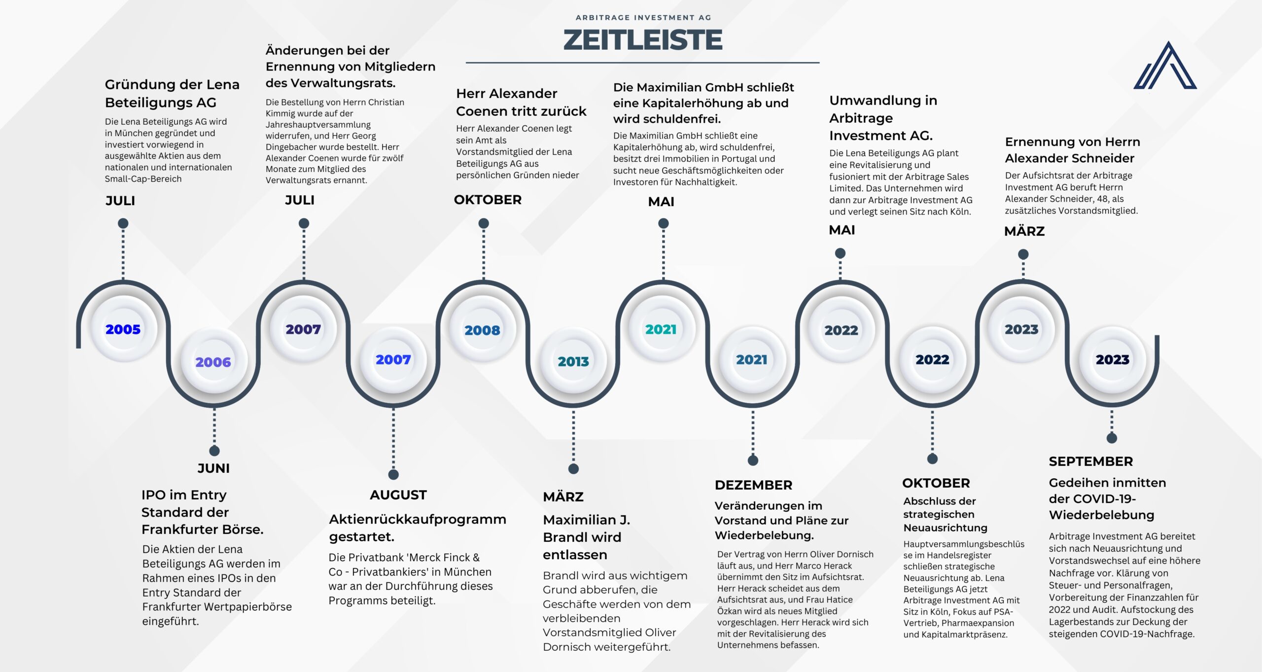 1. + 2. Quartal 2023: Es findet ein umfassender Wechsel in der Führungsebene statt. Ein neuer Vorstand und ein neuer Aufsichtsrat übernehmen die Leitung der Arbitrage Investment AG.
